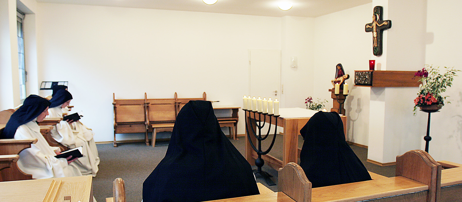 Die Trappistinnen am Donnersberg bei ihrem täglichen Stundengebet. Sie beginnen morgens um 3.45 Uhr mit der nächtlichen Vigil und schließen um 19 Uhr mit der Komplet. Alle Gebetszeiten werden gesungen.