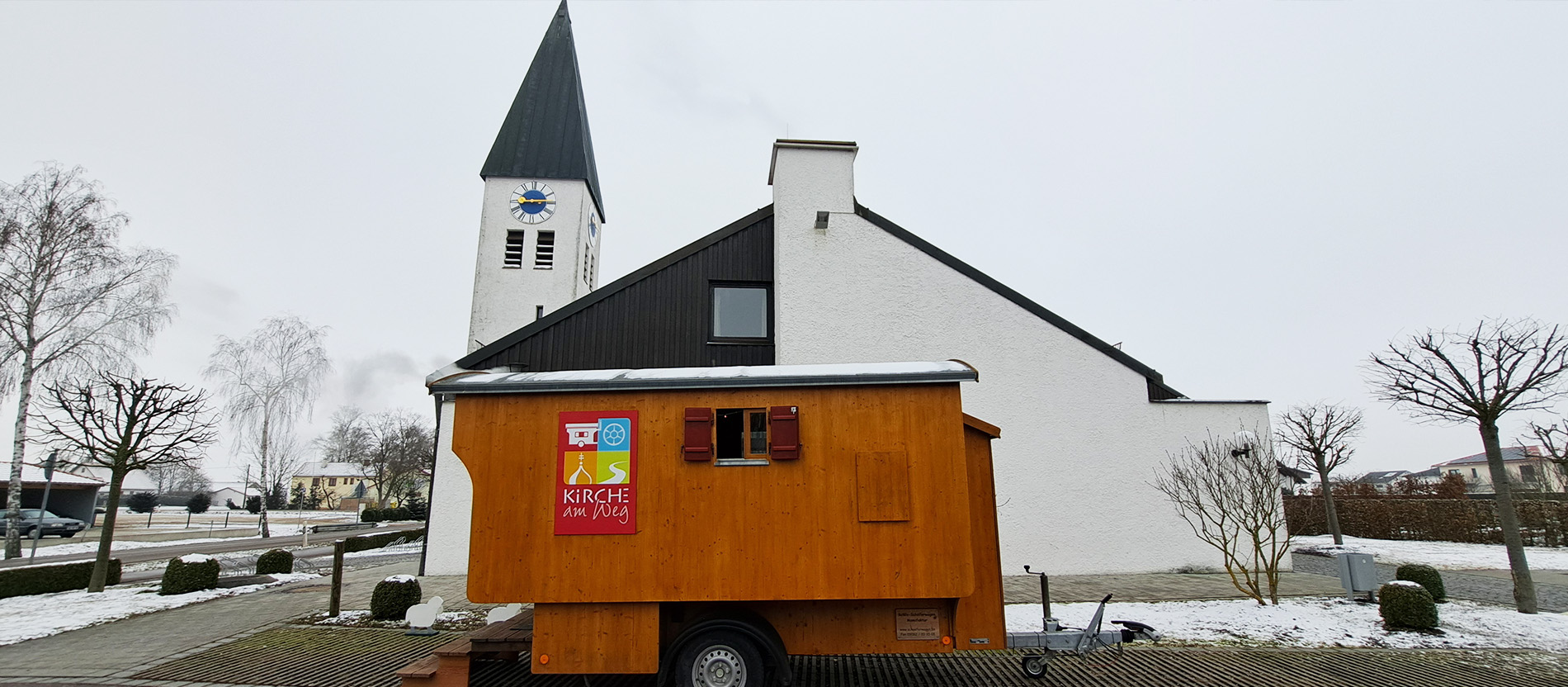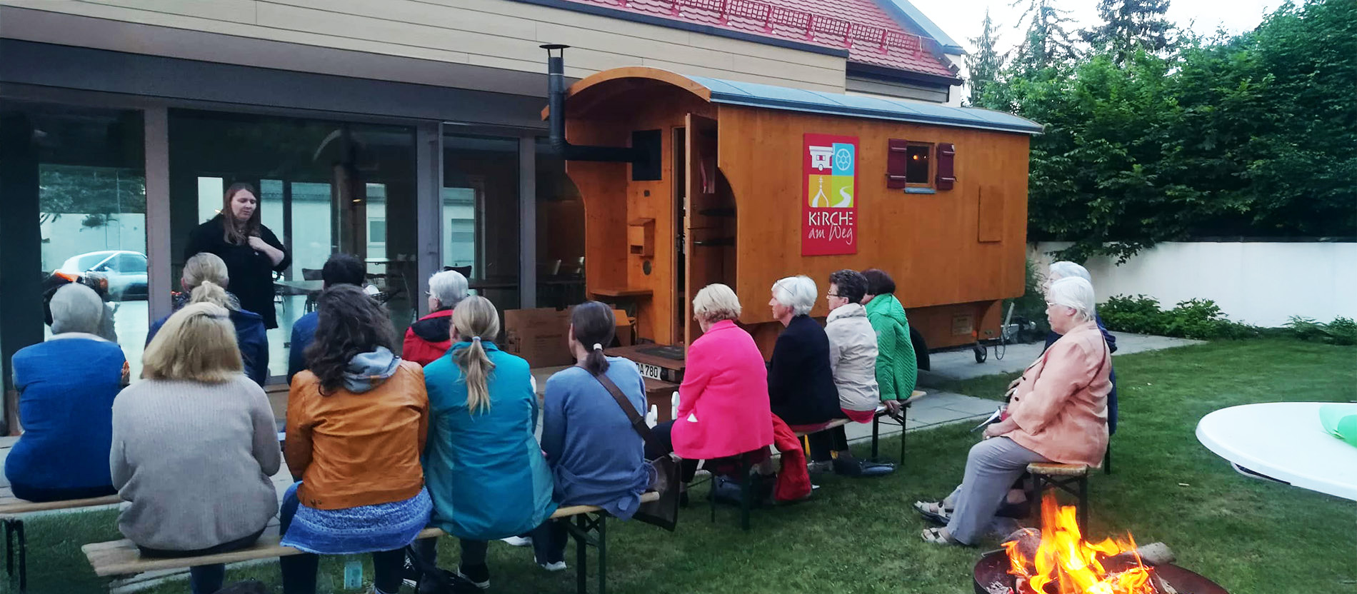 Der Schäferwagen parkt vor einer Kirche in Augsburg. Gemeindereferentin Agnes Dachs fährt damit gerne zu den Menschen hin und erzählt ihnen Geschichten aus der Bibel und vom Leben.