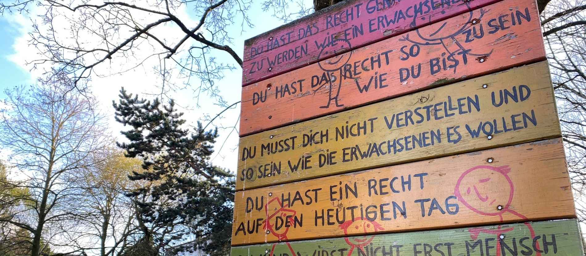 Ich verharrte in diesem Raum. Und beim Rausgehen fiel mir zunächst ein Totenbuch ins Auge. In dem sind gewissenhaft alle Menschen verzeichnet, die mit diesem Ort in Verbindung standen. Erstes Zeichen vom Mensch-Bleiben: Erinnern. Dann las ich mir, nach dem Herausgehen, die bunte Tafel in der Mitte des Platzes durch mit offenbar zentralen Spielregeln dieses Ortes: "Du hast das Recht so zu sein, wie Du bist." Oder: "Du musst dich nicht verstellen und so sein, wie Erwachsene es wollen." Wie schön, dachte ich. Und: Wie schade, dass mein Janosch-Sesamstrassen-Kinderbibel-Ich diese Sätze nicht so verinnerlicht hatte. Dann wären mir womöglich Jahre der Therapie erspart geblieben, die folgen sollten.