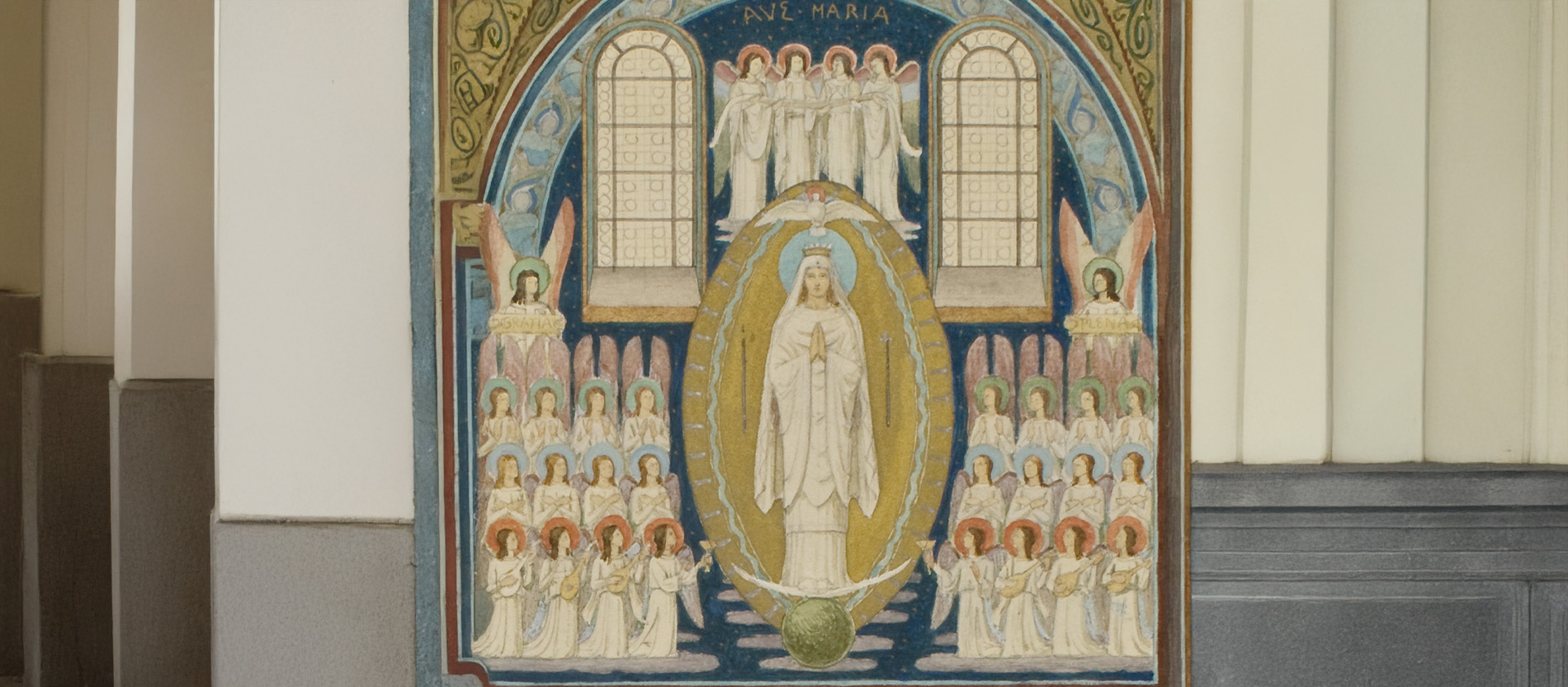 Schwester Raphaela: In den drei Bogenfeldern der Marienwand waren neun Frauen aus dem Alten Testament dargestellt. Es sind Frauen der Stärke: Sarah, Eva, Rebecca, Esther, Ruth, Sulamith, Judith, Abigail und Jaël. Darüber befand sich eine fast fünf Meter hohe Darstellung der Muttergottes. Sie wurde ebenfalls übertüncht. Eine meiner Mitschwestern aus der Abtei Rüdesheim hat dazu einiges herausgefunden und geschrieben. Die Muttergottes-Darstellung zeigte Maria gekleidet in ein Obergewand im Schnitt einer Kasel. Das Untergewand ist gestuft dargestellt, wie bei einem Bischof, der unter der Kasel als Rangabzeichen über der Albe die Dalmatik trägt. Maria wurde als Bischöfin dargestellt. Das ist für eine Malerei von 1909 schon sehr außergewöhnlich. Aber für einen Frauenkonvent, dem das täglich vor Augen stand, ist das inspirierend. Umso mehr schmerzt uns heute der Verlust. Man könnte die Ausmalung natürlich wieder freilegen und restaurieren. Man sollte das unbedingt tun, aber das wäre sehr kostspielig und aus unseren eigenen Mitteln nicht zu leisten.