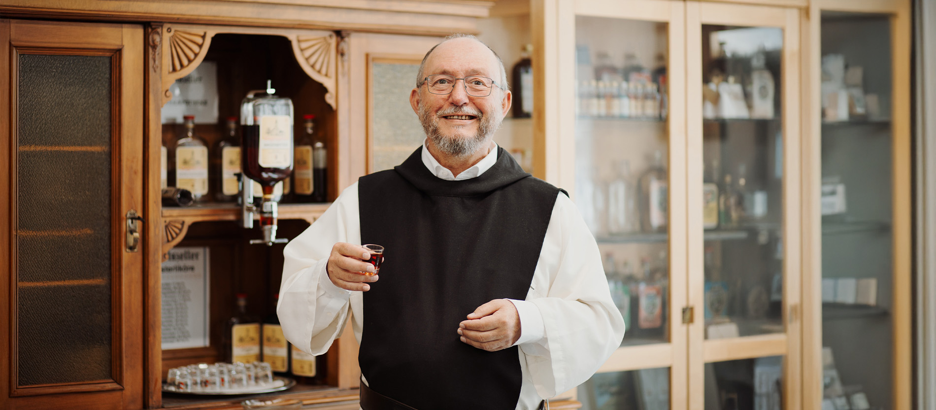 Bruder Reinhard trinkt selbst gerne den Magenbitter aus eigener Produktion. Die darin verwendeten Kräuter haben, wie er sagt, Arzneibuchqualitäten.