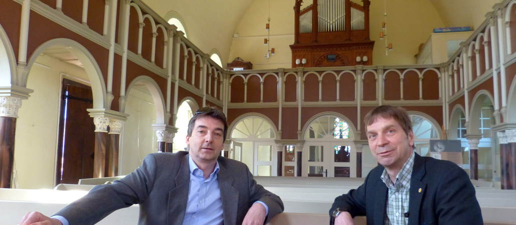 Der Pfarrer der Christusgemeinde Großkühnau-Ziebigk, Stephan Grötzsch, und der Landespolizeipfarrer der Evangelischen Kirche Anhalts, Michael Bertling, in der ersten Polizeikirche Deutschlands im Dessau-Roßlauer Ortsteil Großkühnau (Sachsen-Anhalt).