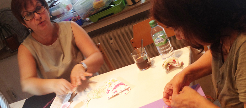 Die Kursleiterin und Psychotherapeutin Hamidiye Ünal (l.) berät Teilnehmerin Zive beim Knüpfen von Freundschaftsbändern.