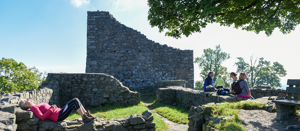 Die Wandergruppe legt eine Pause an der Löwenburg-Ruine ein. Eine Frau sonnt sich. Fastenwandern mit dem ausgebildeten Wanderführer Peter Nitz am 2. September 2014 auf dem Rheinsteig bei Königswinter.