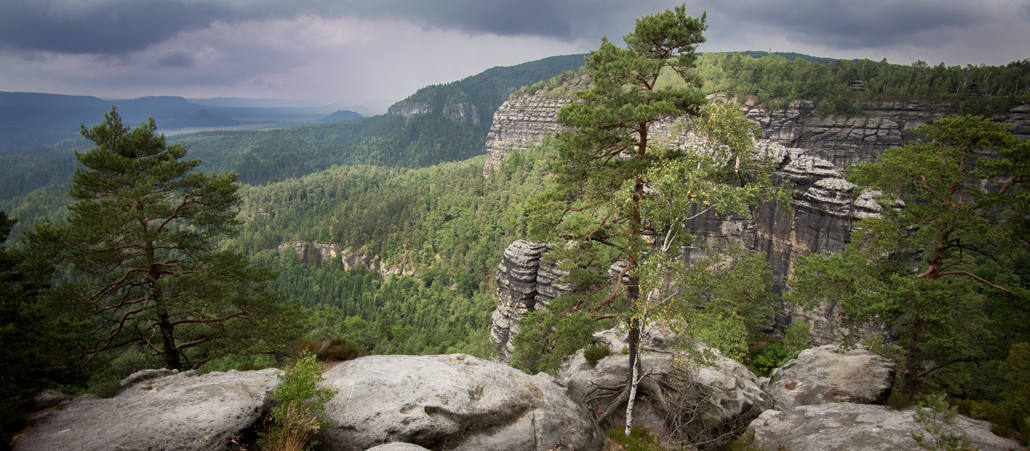 Wald, Felsen, zwei Bäume auf Felsen im Vordergrund, grauverhangener Himmel